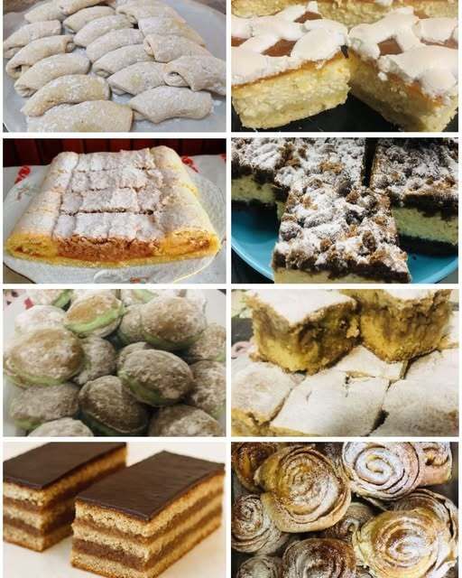 Η εικόνα δείχνει διάφορα σπιτικά αρτοσκευάσματα, τόσο κλασικές ουγγρικές όσο και κεντροευρωπαϊκές συνταγές. Ακολουθεί μια σύντομη περιγραφή και μια ιδέα συνταγής για το καθένα: