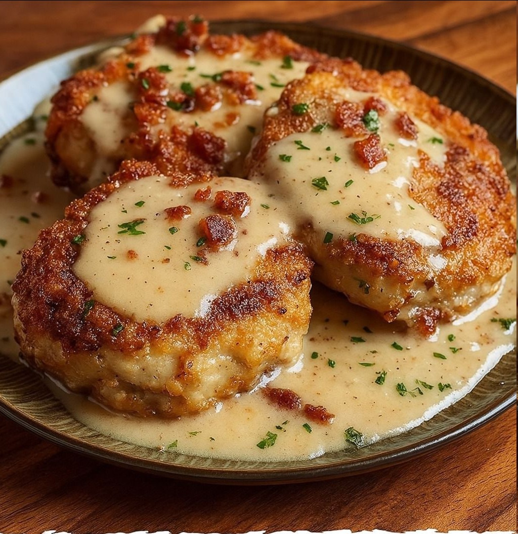 Χοιρινές μπριζόλες τηγανητές σε χωριάτικο στιλ με σάλτσα μπέικον